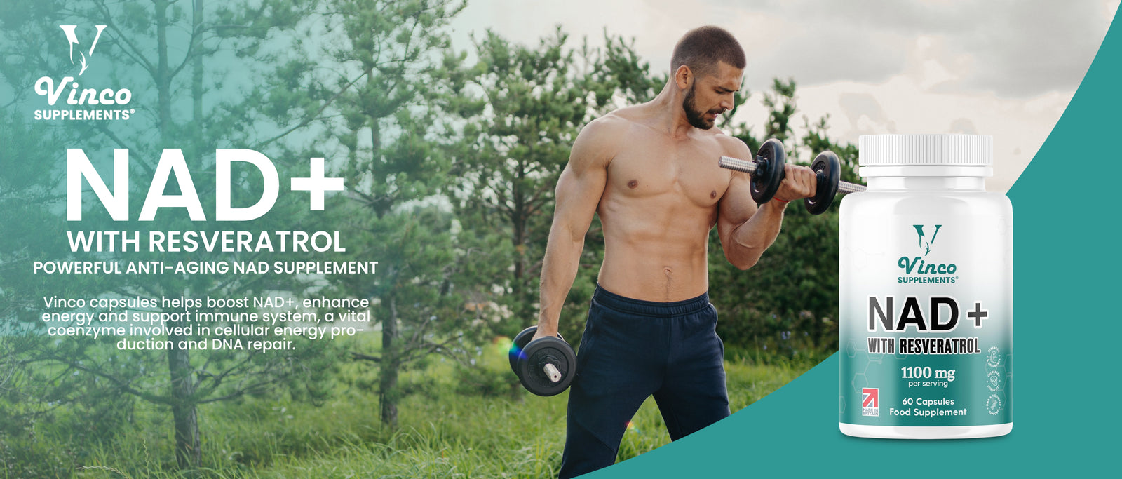 Boost energy, support immunity, and fight ageing with Vinco's Ultra NAD+ Resveratrol Supplement. It enhances cellular energy, DNA repair, and skin health, featuring 600mg Resveratrol, 500mg NAD+, and 50mg Black Pepper Extract for maximum absorption.