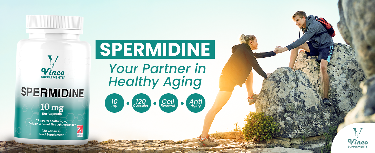 Spermidine supports anti-ageing by enhancing cellular renewal and autophagy, boosts memory, improves sleep quality, promotes strong hair and nails, protects against age-related illnesses, and enhances overall wellness. It helps maintain youthful vitality, energy, and long-term health.