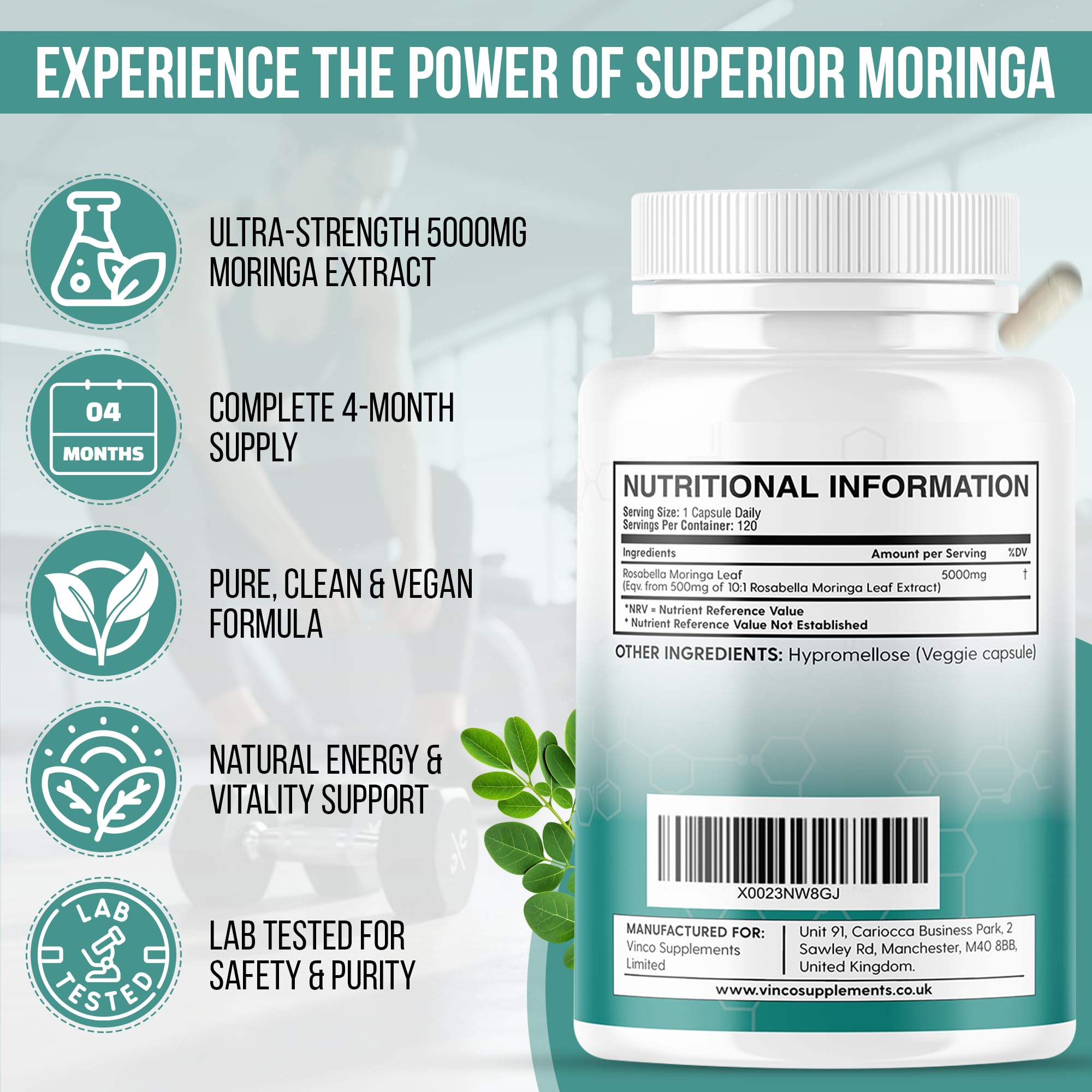 Details: Product description Moringa offers exceptional wellness benefits as a complete nutritional supplement. This ancient superfood contains more vitamin C than oranges, more calcium than milk, and more potassium than bananas. The concentrated 10:1 extract means each capsule delivers powerful plant compounds without the bulk of raw powder. Enhanced with Black Pepper for better absorption, this formulation helps your body access all the natural goodness Moringa provides. Whether supporting immune function, boosting daily energy, or simply filling nutritional gaps, this clean vegan supplement works naturally with your body. Four months of wellness support arrives in one convenient bottle. Ingredients Rosabella Moringa Leaf, Hypromellose (Veggie Capsule) Directions Take 1 capsule daily with a full glass of water, preferably with a meal Safety Warning Food supplements should not be used as a substitute for a varied diet. Do not exceed the stated Dose. Children under the age of 18, pregnant or lactating women, and under medical supervision should consult a GP before taking any food supplements.
