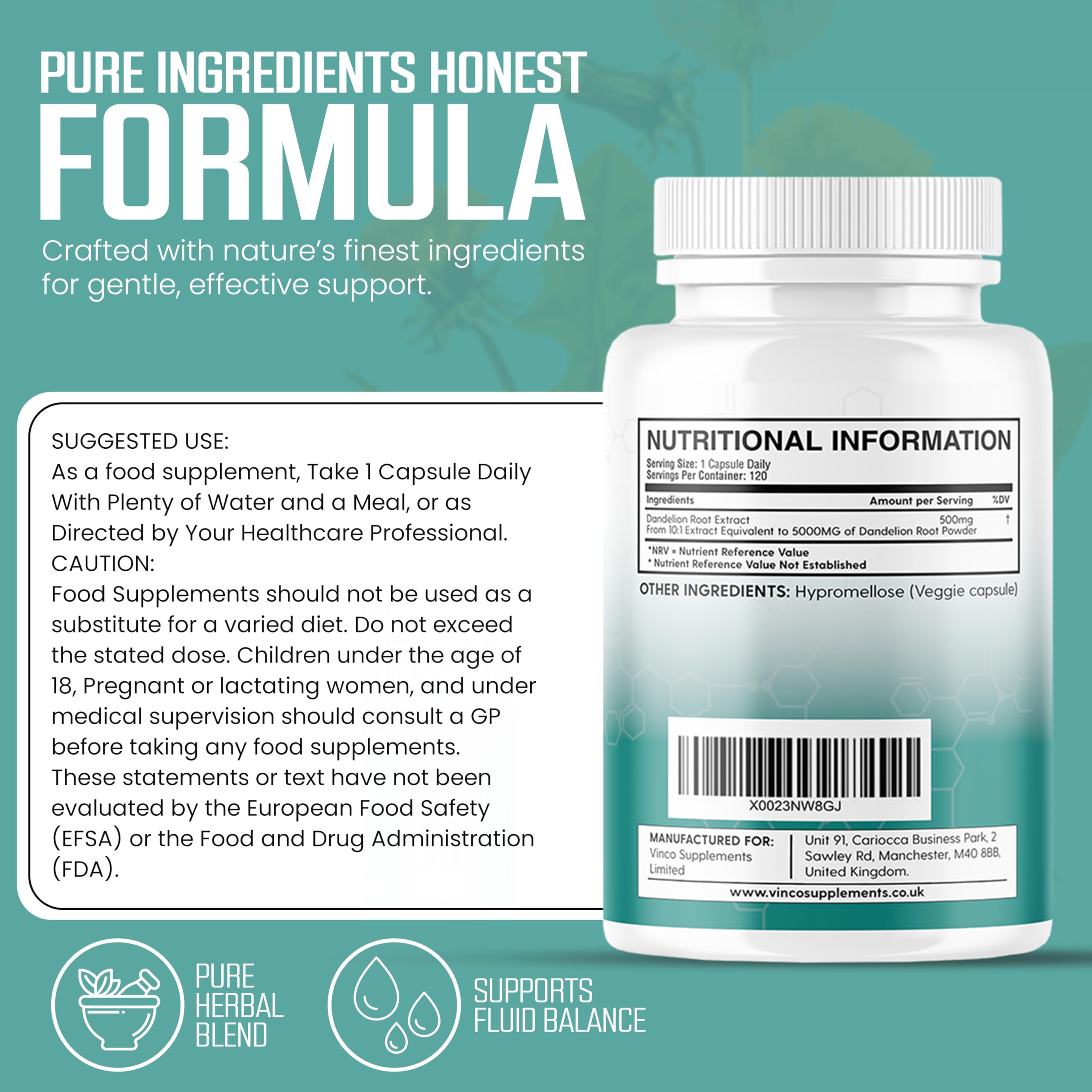 High Strength Herbal Support - These capsules deliver 500mg of potent Dandelion Root extract in a 10:1 ratio, giving you the power of 5000mg raw powder. This strong formula helps your body manage occasional water retention and bloating naturally. Each bottle provides a full 4-month supply