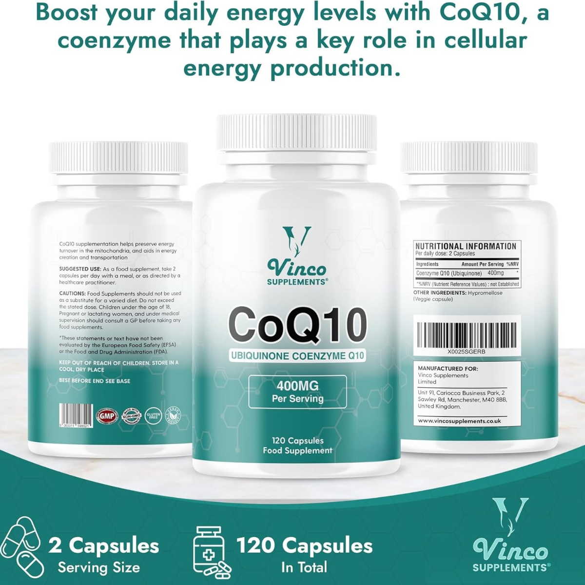 CoQ10 400mg supports heart health, boosts energy and exercise performance, improves sleep quality, protects against oxidative stress, aids collagen production for anti-ageing, and undergoes strict quality testing for purity and potency.