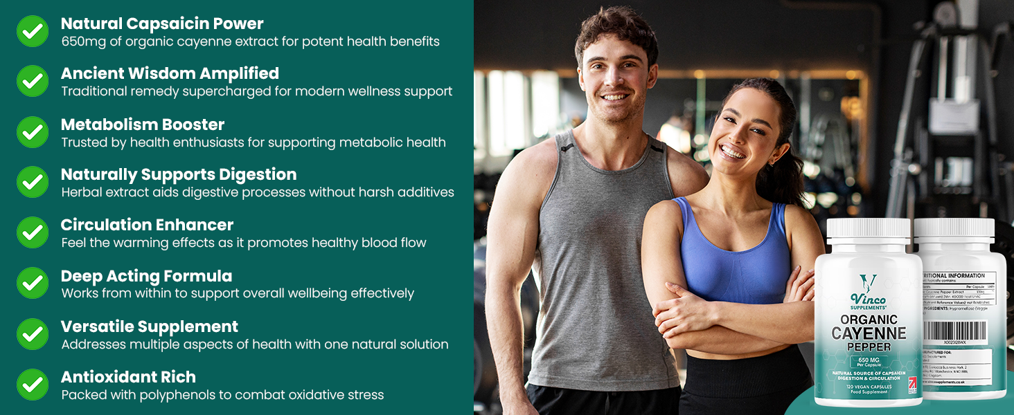 Promotes digestion, circulation, and metabolism with antioxidant-rich polyphenols. High-potency formula (40,000 HU) rich in capsaicin for maximum benefit. 120 vegan capsules for a 2-month supply. UK-made to GMP standards, free from fillers, binders, or additives.