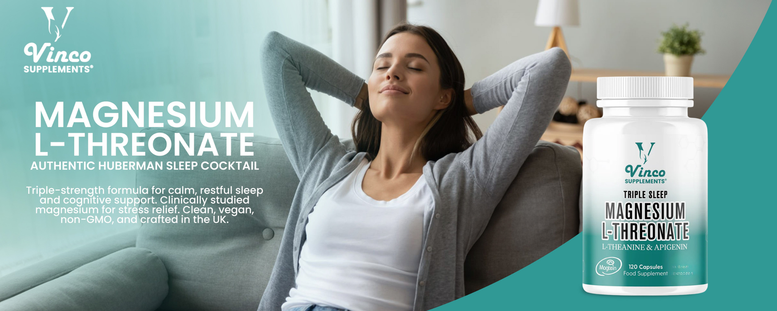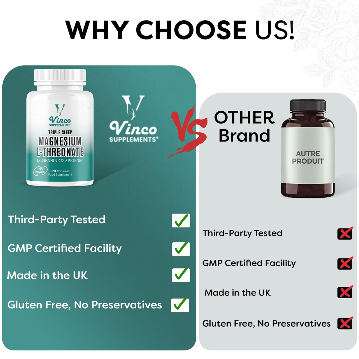Vinco Supplements’ magnesium sleep formula promotes deep sleep and cognitive support with Triple Sleep Magnesium L-Threonate. It's 100% vegan, gluten-free, and GMO-free, combining magnesium, L-Theanine, and Apigenin to calm the mind, improve sleep, and support cognitive wellness
